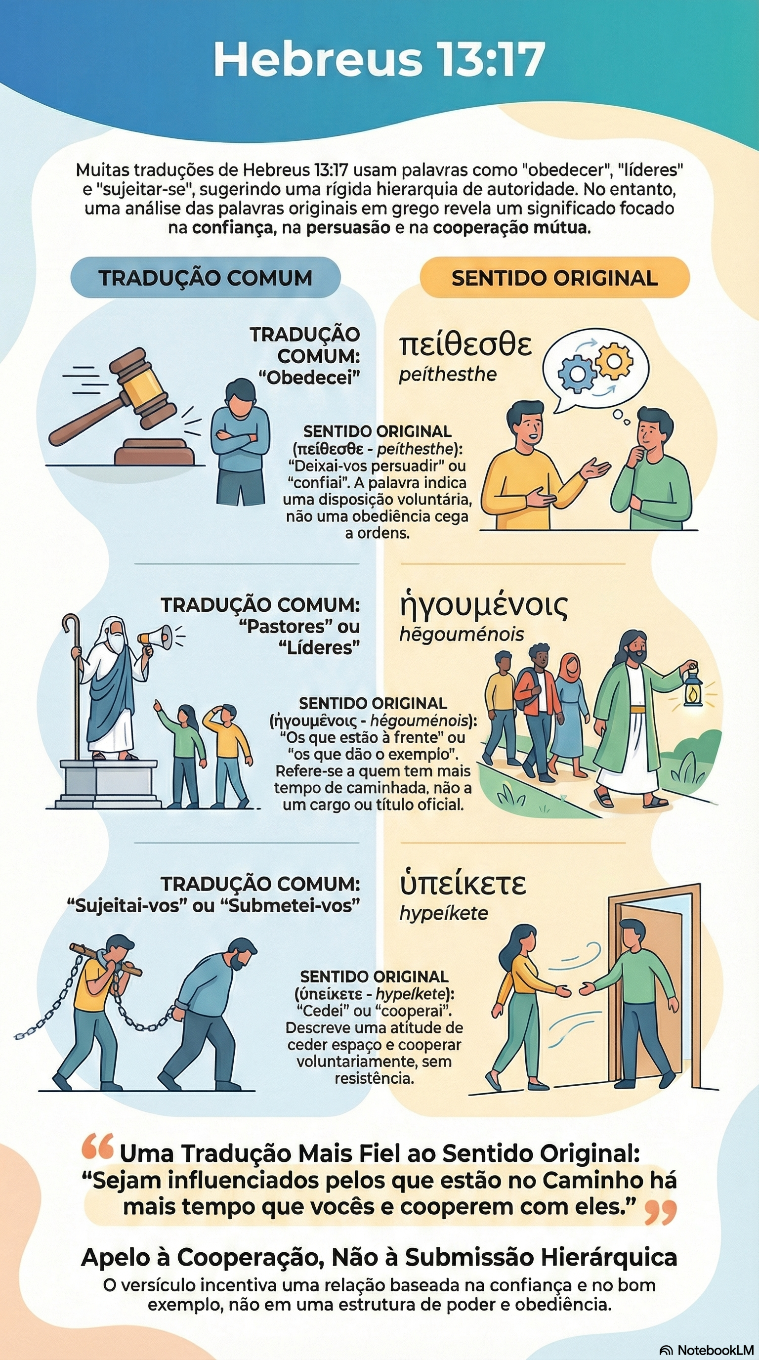 Em Hebreus 13:17, o termo πείθεσθε (peíthesthe) não implica uma obediência cega a ordens autoritárias, mas sim uma disposição voluntária de ser persuadido, de confiar na palavra ou no exemplo de alguém. Traduções como “obedecei” impõem uma carga de submissão autoritária que não está no verbo. O mais natural seria: “Deixem-se persuadir por...” ou “Estejam dispostos a confiar em...”